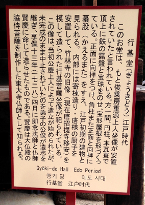 | 和田 2018年10月21日 昨日行われた『行基さん大感謝祭』のブースのお手伝いがてら、 東大寺の行基堂に行きました。 私個人でも何度も訪れている東大寺ですが、行基さんが祀られている お堂については気が付いていませんでした。このイベントを機に、 「これは行ってお参りしなければ、行基さんに申し訳ないな…」と 思ったのがきっかけです(笑)。 ![]() 行基堂は、大仏殿伽藍から三月堂・二月堂へと至る途中にある大鐘楼の広場に あります。同じ場所には鎌倉期の中興の祖、重源上人を祀った俊乗堂もあります。 ![]() 行基堂は小さなお堂でした。江戸時代に建立され、紆余曲折はあったものの、 造像された行基菩薩像が祀られています。 ![]() 「行基さん、すみません!」と心の中で念じながら、写真を撮らせてもらいました。 |