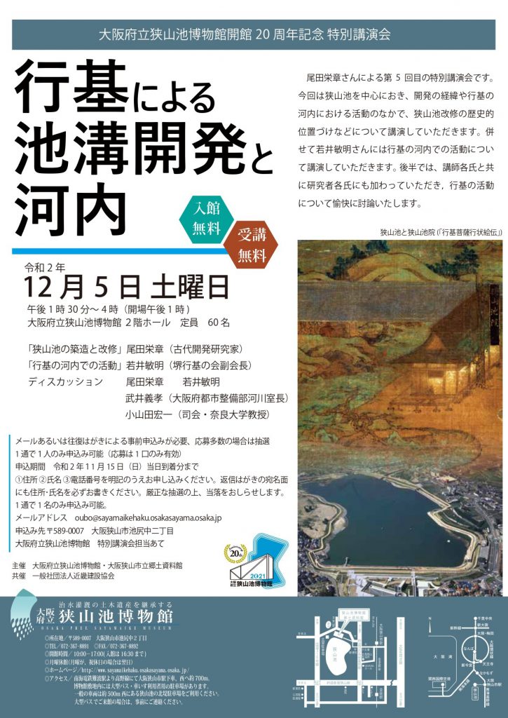 | 若井敏明 2020年10月31日 来る12月5日に狭山池博物館で開催される「行基による池溝開発と河内」という講演会に、 本会副会長という立場で、尾田栄章さんと並んで、講演とディスカッションをいたします。 事前申し込みが必要ですが、興味がおありの方はお越しになってください。