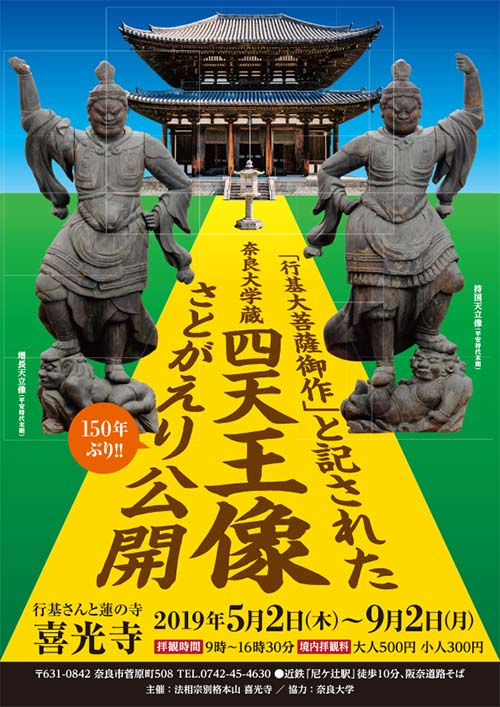| 和田 2019年5月19日 若井先生からご報告いただいた「喜光寺・四天王像里帰り」ですが、 チラシがありましたので、掲載いたします。
