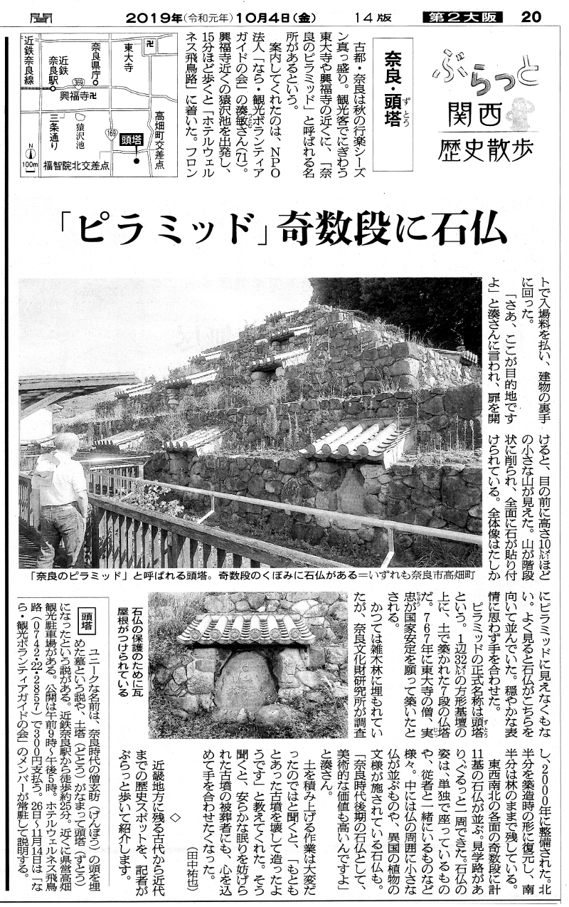 | 和田 2019年10月6日 2019年10月4日付・朝日新聞に「奈良・頭塔」が紹介されていましたので、 こちらにて掲載させていただきます。 「土で造った塔」としては、行基が造った「大野寺・土塔」と、 この奈良の「頭塔」しか国内では例がありません。
