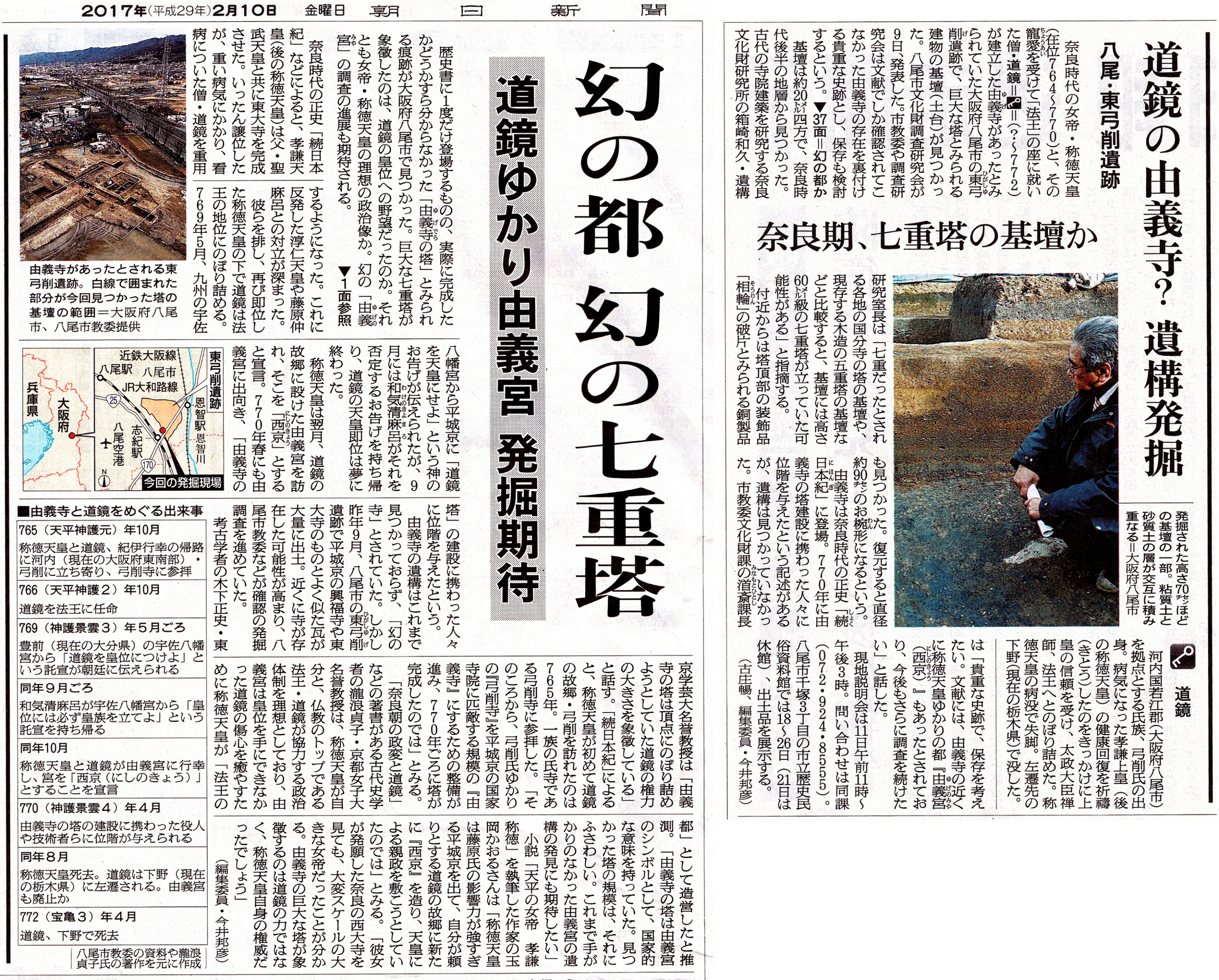 | 和田 2017年2月11日 先月の学習会で、吉田会長が取り上げた道鏡について、 どこにあるかはっきりと分からない「弓削寺・宮(由義寺・宮)」らしい 遺構が発見されたと報じられました。 ▼画像をクリックすると別画面で拡大します。 ![]() |