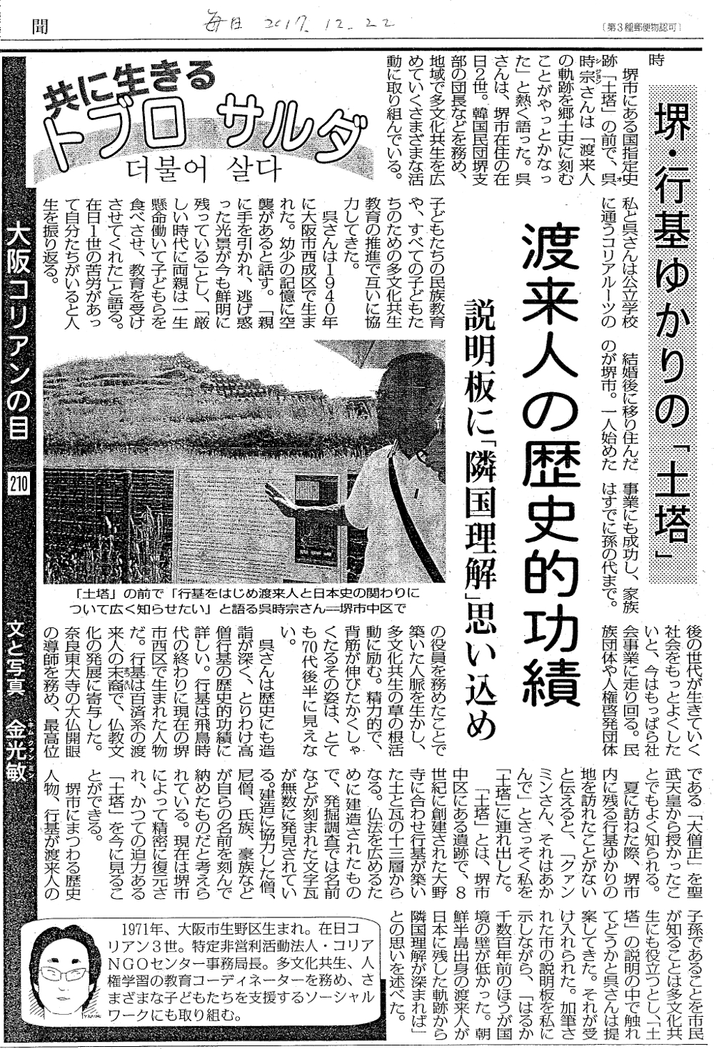 | 和田 2016年12月4日 行基の会2016年秋の史跡巡り 日時:2016年11月27日 費用:7000円 集合・出発:南海高野線三国ヶ丘駅前 9:00 (1)東住吉区矢田7丁目「阿麻美許曾(あまみこそ)神社」行基居住伝承地 9:40~10:00 (2)東住吉区矢田富田墓地「行基1000年忌記念碑」 10:20~10:40 (3)天王寺区逢坂町「一心寺」骨仏 11:00~11:20 (4)天王寺区「安井神社」真田幸村戦死の地・幸村像 11:30~11:50 (5)東成区東小橋 韓流カフェ茶母で韓定食の昼食 12:10~13:00 (6)東小橋韓国市場の案内解説(在日コリアン人権センター・高敬一氏)、買物 13:10~13:50 (7)生野区桃谷3丁目「御幸森天神社」王仁博士の歌碑 14:20~14:40 (8)生野コリアンタウンで散策・買物 14:40~15:20 (9)天王寺区玉造本町「三光神社」真田丸跡・真田幸村像 15:40~16:00 帰着:南海高野線三国ヶ丘駅前 16:50 ▼史跡巡り資料(クリックすると別画面で開きます) |