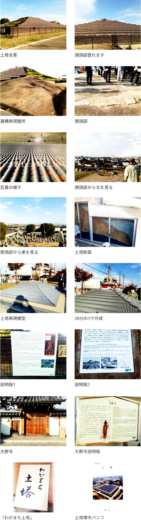 | 和田 2019年11月17日 本日11月17日、新聞で知った「土塔見学会」に行ってきました。 初めての土塔、どういうものかな…と思いつつ、 寝坊して自治会さんの説明会には参加できませんでした。 その代りと言ってはなんですが、堺市の文化財課の ウォークラリーが行われていて、便乗参加しました。 予備知識はありましたが、土塔は1辺が50.1mの 巨大な「塔」でした。この日は、年に一回という 頭頂部にまで昇ることができ、今ではマンションや ビルに囲まれてますが、千年前は河内平野を見渡すことが できたという昔を想像できました。 また、土塔町自治会が発行した『わがまち土塔』を購入。 その本の制作に主に携わった藤木さんと話すこともできました。 (ひとまず当会のことを説明いたしました。しかし、藤木さんは 今回の地元歴史本編集だけでなく、地元の祭りや他の地域からの 同様の企画にも多数関わっていらっしゃるようで、当会のことは ご存知でしたが、今のところ活動が手一杯とのことでした)