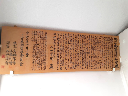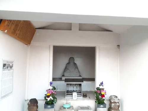 | 和田 2021年9月24日 役員をしている牧野さんから行基像発見のコメントをいただいたので、掲載します。 「松原にある上田墓地で行基像を見つけました! ちょうど松原市歴史ウォークを書いた西田さんと遭遇。 話を聞かせてもらいました(^o^)v 扁額は雨ざらして剥げてしまってたのを昨年、西田さんが修復したそうです。 なんと!吉田先生と一緒に仕事したことあるらしいです。 もともと編集の仕事してて吉田先生の本を出すの手伝ったと話してました。」 ![]() ▲行基堂 ![]() ▲扁額 ![]() ▲行基像