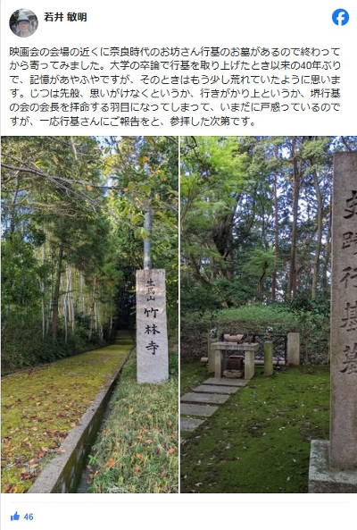 | 若井敏明 2016年4月24日 ホームページ開設おめでとうございます。 行基さんはつたない卒論に取り上げてからのお付き合いです。 これから私もいろいろと発信していきたく思いますので どうかよろしくお願いいたします。 |