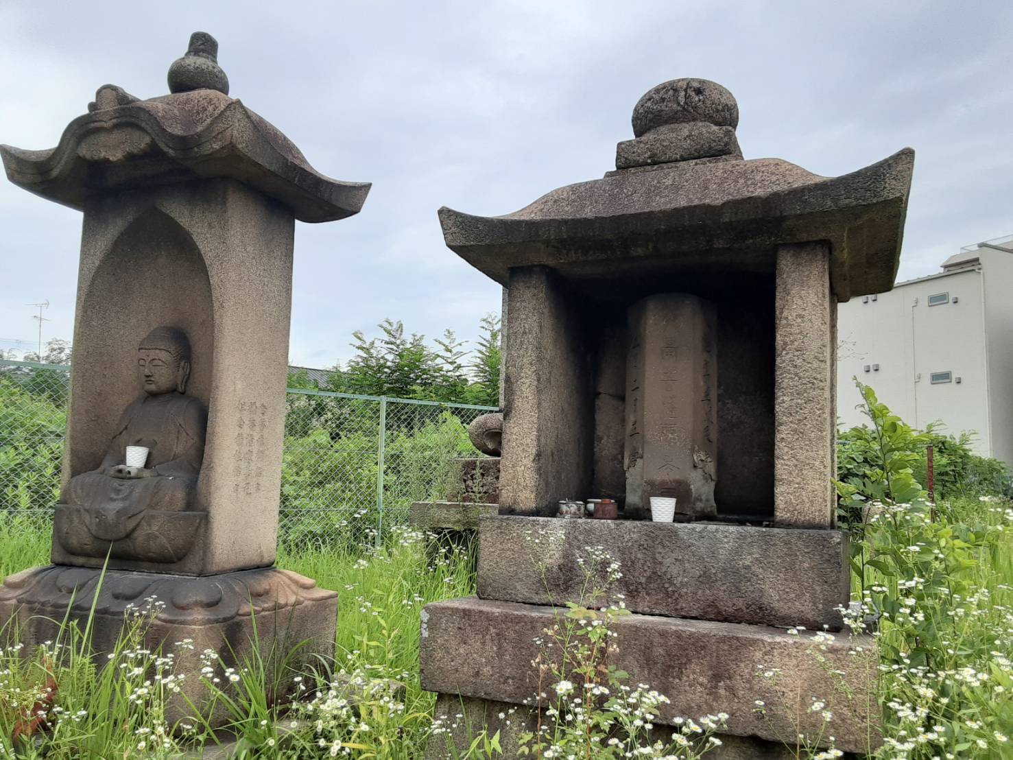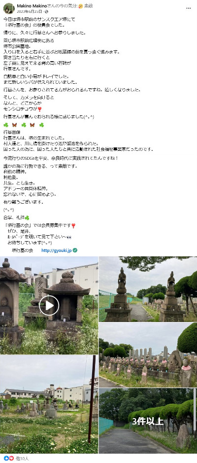 | 牧野瑞穂 2021年7月5日 JR堺市駅前の墓地にある行基さんの「千年忌の供養塔」にお参りしてきました。 (注:いつも学習会・総会を行っている堺市立サンクスエアの前です) 一度、史跡巡りでみんなでお参りしたことがありました。 雨上がりで雑草に囲まれていましたが、小さな白い花が一面に咲いていて きれいでした。まだ新しいシバが供えられていました。行基さんを慕って お参りされている方がおられる様子に嬉しくなりました。 また、時間を作ってお参りさせて頂こうと思います。 駅前なので分かりやすいです。入り口から真っ直ぐ奥まで進み、 突き当たりを右に更に真っ直ぐ行くと右手に見えてきます。 左手にに水道があるので直ぐ分かります。 お時間ありましたら是非お参りされてみて下さい。 石碑の修復が必要だと思うのですが、どうすれば良いものか...。 皆様のお知恵を頂きとうございます。 ![]() ▲堺市立サンクスエアの前の公園隣接の墓地にあります(写真中央) ![]() ▲行基さんの「千年忌の供養塔」その1 ![]() ▲行基さんの「千年忌の供養塔」その2 |