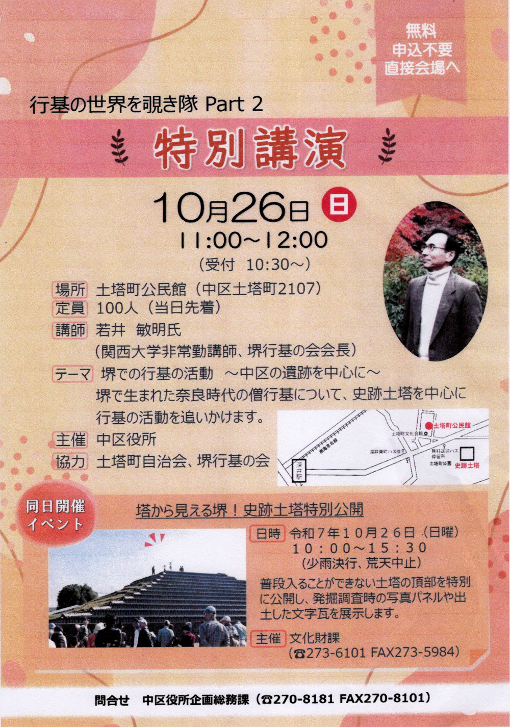 10月26日(日)、『史跡土塔特別公開』に当会は参加しました。行基建立の史跡土塔特別公開(通常登れない頭頂部を開放)にて、当会ブースを開設。